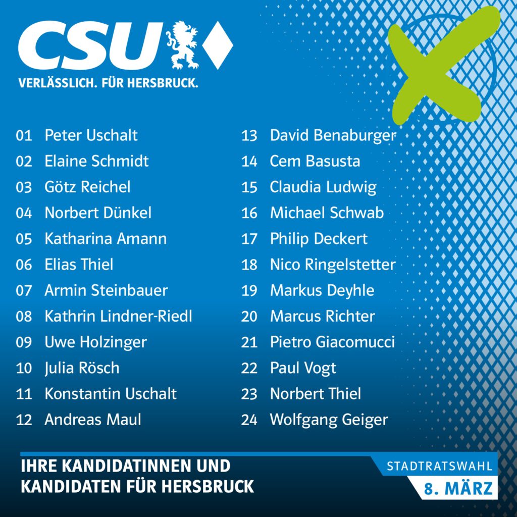 Wir, die CSU Ortsverbände in Hersbruck und Altensittenbach sowie die CSU-Stadtratsfraktion möchten Ihnen einen Überblick über unsere Arbeit und die Köpfe hinter der CSU in Hersbruck geben. Sie erfahren Näheres über aktuelle Veranstaltungen, geplante Aktionen und über die politische Arbeit der Stadtratsfraktion. Lernen Sie uns näher kennen – wir laden Sie herzlich dazu ein.